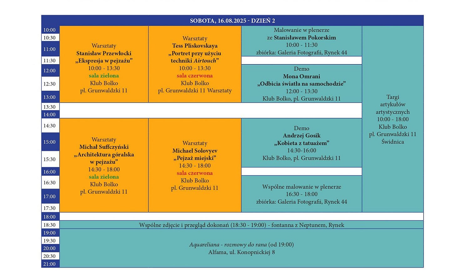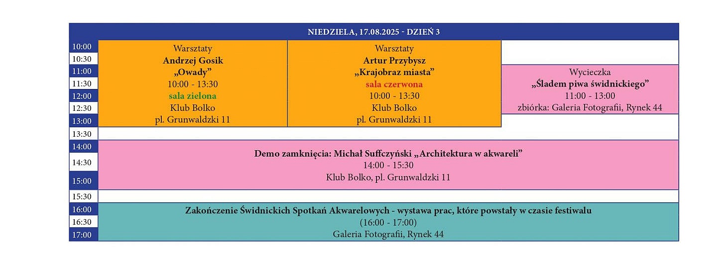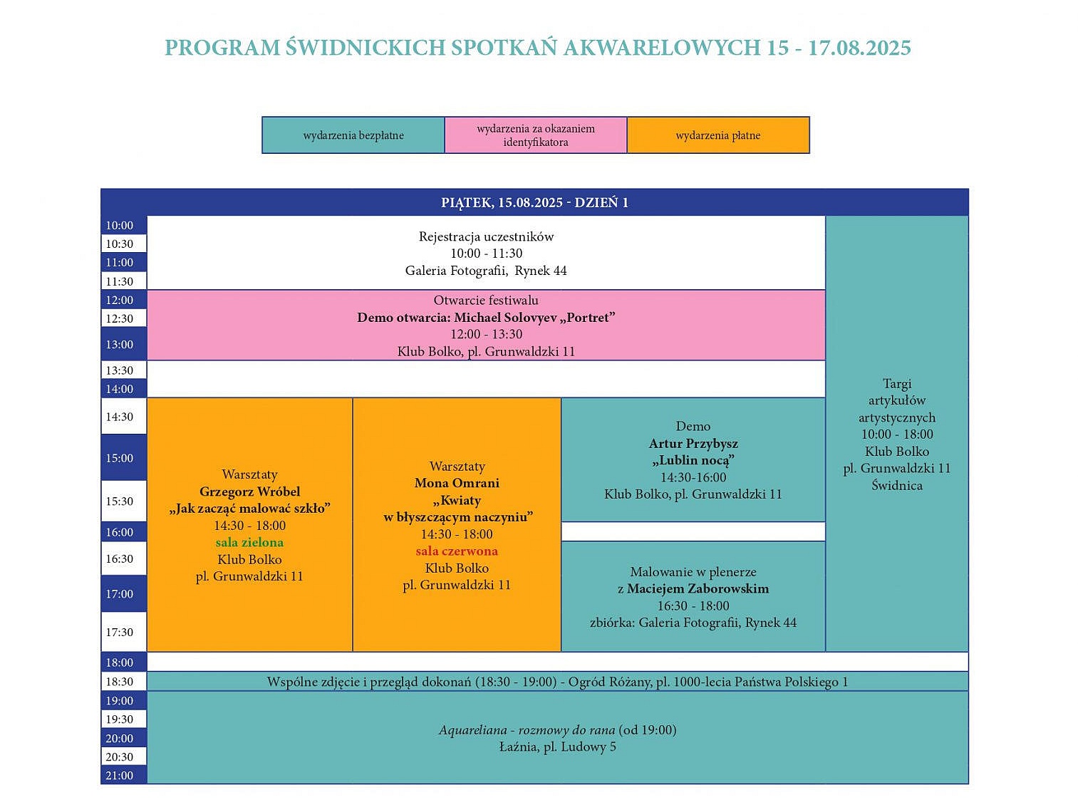 Świdnickie Spotkania Akwarelowe to nowy, trzydniowy festiwal malarski, który odbył się w dniach 15–17 sierpnia 2025 roku i zorganizowany został przez Świdnicki Ośrodek Kultury pod artystycznym patronatem Stowarzyszenia Akwarelistów Polskich.